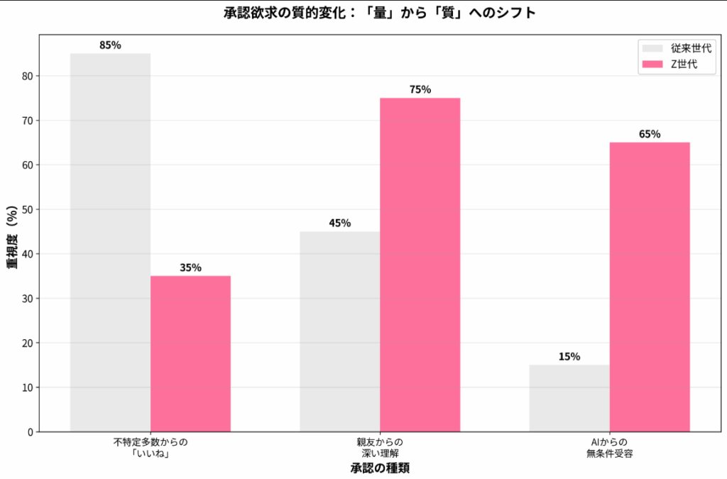 この変化を可視化したのが以下の図である。従来世代が「不特定多数からの『いいね』」を85%も重視していたのに対し、Z世代ではその数値が35%まで急落。代わりに「親友からの深い理解」が75%、「AIからの無条件受容」が65%と、承認の「質」を求める傾向が顕著になっている。